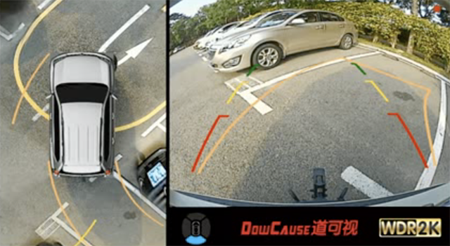 道可視360°全景通過“倒車入庫模式”,同時(shí)顯示倒車場(chǎng)景下的鳥瞰圖以及實(shí)時(shí)的后視影像,結(jié)合可跟隨方向盤方向而轉(zhuǎn)動(dòng)的精準(zhǔn)倒車軌跡線,精準(zhǔn)的計(jì)算出行車軌跡(誤差小于3CM),幫助駕駛員準(zhǔn)確、安全、平穩(wěn)的倒車入庫。