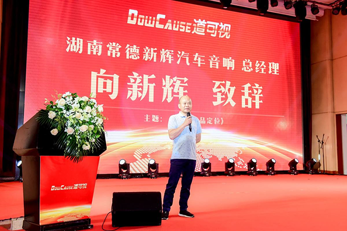 湖南常德新輝汽車(chē)音響總經(jīng)理向新輝上臺(tái)發(fā)言,他以自身多年門(mén)店運(yùn)營(yíng)經(jīng)驗(yàn),為嘉賓帶來(lái)“門(mén)店產(chǎn)品定位”的主題分享。